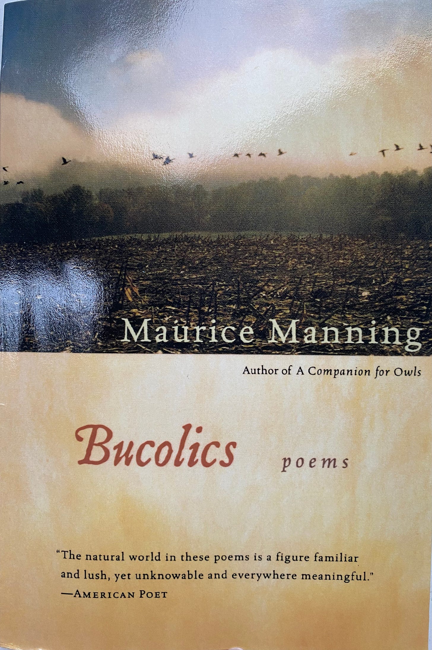 Maurice Manning’s third collection Bucolics was published in 2007, which seems like a lifetime ago (before I was married and had three kids; the year I got my first poem published). But taking time to peruse this in the early morning felt like a devotional. I’d already owned another book of his, and heard him read and speak at the 2023 Calvin Festival of Faith and writing (along with Christian Wiman and Kaveh Akbar, which was a great experience).